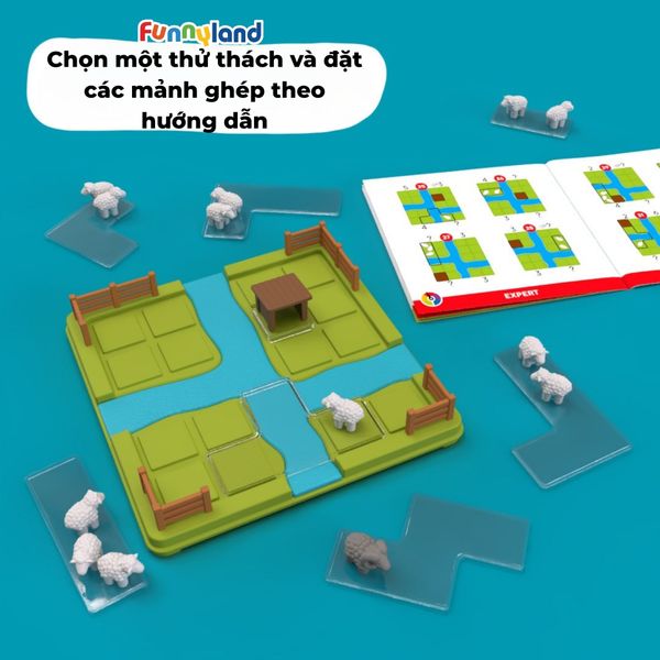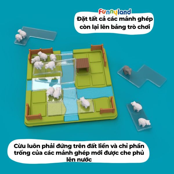 - Đặt các mảnh ghép lên bảng sao cho tất cả các chú cừu đều ở trên đất liền (phần màu xanh lá cây trên bảng), và phần rỗng của các mảnh ghép có thể che phủ nước (phần màu xanh dương).