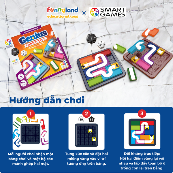 Genius Connection là trò chơi xếp hình đối kháng hoặc chơi đơn, với thử thách xúc xắc ngẫu nhiên và 576 câu đố từ dễ đến khó, đòi hỏi tư duy nhanh và chiến lược.